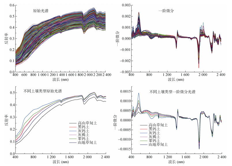 图 2 土壤原始光谱反射率及一阶微分变换 Fig. 2 Soil original spectral reflectance and first-order differential spectra of different soil types |