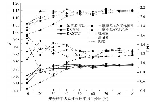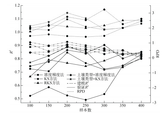 对比模型预测精度发现加入土壤类型的浓度梯度法和KS方法挑选的建模样本集的模型相比其他建模样本选择方法挑选的建模样本集的模型验证R2和RPD值相对较大。且在样本数较少时更加明显,说明加入土壤类型可以很好地优化建模样本选择方法满足样本点较少达到很好的预测效果。