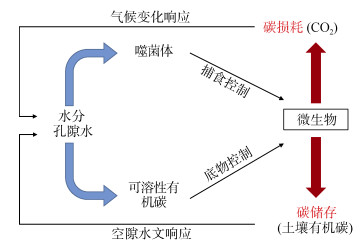 图 2 土壤中碳转化的top-down(噬菌体捕食)及bottom-up(物理基质有效性)控制途径概念模型 Fig. 2 Conceptual models of control pathways of top-down (phage predation) and bottom-up (physical substrate availability) in soil carbon transformat ion |