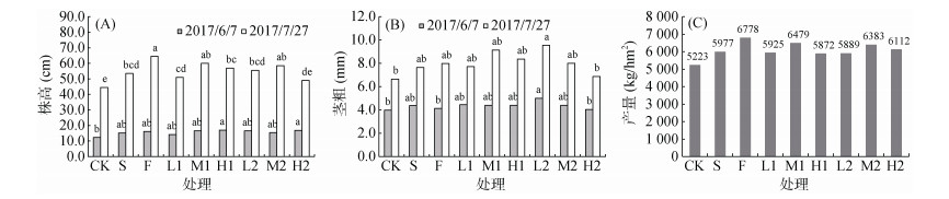 2.3 不同改良剂对棉花生长的影响棉花生育期间,分别于2017年6月7日和7月27日对棉花株高、茎粗指标进行了测定(图 1)。从图 1A可以看出,在棉花生长前期,除CK外,其他处理之间无明显差别,H1和H2处理株高最大,分别为17.1和16.9 cm; 在棉花生长后期,F处理棉花生长加速,株高最高,为64.5 cm,其次为M1和M2处理,CK株高最低为44.5 cm。从显著性分析来看,两次测定结果F、M1和M2处理之间无显著差别。从图 1B可以看出,不论在棉花生长早期还是后期,L2处理棉花茎粗均最大。除CK和H2处理外,其他处理在棉花生长后期茎粗无显著差别; 除H2处理外,施用改良剂处理棉花茎粗均显著大于CK,表明改良剂的施用改善了棉花根系生长的环境条件,更加有利于根层养分的利用,促进棉花的生长。