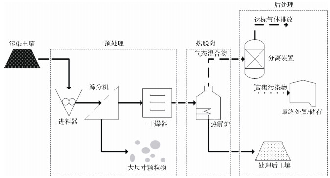 1 热脱附原理及装置热脱附属于热处理方法的一种, 是通过直接或间接加热使土壤中的污染物经过相变、精馏、氧化、热解等过程逸出, 从而与土壤分离并加以去除的技术方法, 常用于多氯联苯、农药、含氯溶剂、烃类等物质污染[9-13]的治理, 张攀等[14]曾针对土壤中的目标污染物硝基苯进行热脱附研究, 试验研究出最佳条件下硝基苯的热脱附效率达到82.88%, 为热脱附法修复污染场地中的硝基苯提供了依据。以最成熟的异位热脱附(Ex situ thermal desorption)为例[12], 修复受污染土壤的工艺流程分为3段:预处理、热脱附和后处理, 如图 1所示。