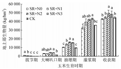 (图中小写字母不同表示玉米同一生育期不同处理间地上部生物量差异达P < 0.05显著水平) 图 1 秸秆还田配施氮肥对玉米地上部生物量的影响 Fig. 1 Effects of straw returning with nitrogen fertilizer on aboveground biomass of maize |