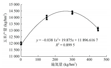 图 2 秸秆还田下不同施氮量-玉米产量回归曲线 Fig. 2 Regression of maize yield with straw returning with different rates of nitrogen fertilizer |
