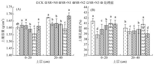 2.3 秸秆还田配施氮肥对土壤容重及土壤孔隙度的影响玉米收获后, 秸秆还田配施氮肥能显著减少土壤容重(P < 0.05, 图 3A)。与处理前相比, 0 ~ 20 cm土层土壤容重随施氮量的增加而降低, 其中以SR+N3最为明显, 降幅达3.20%, SR+N2次之, 降幅为1.25%。而CK和SR+N1土壤容重较处理前差异不显著, SR+ N0处理则较处理前有增加趋势。20 ~ 40 cm土层土壤容重变化和0 ~ 20 cm类似, 其中SR+N3处理较处理前降低6.29%(P < 0.05), SR+N0、SR+N1、SR+N2处理间差异不显著, 较处理前降低3.56%, CK处理与处理前无明显差异。可见, 秸秆还田配施一定量的氮肥相对于秸秆不还田施氮肥可有效降低土壤容重。
