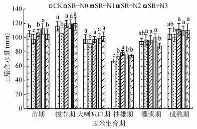 2.4 秸秆还田配施氮肥对土壤含水量的影响图 4反映的是玉米不同生育时期0 ~ 100 cm土层土壤含水量。土壤含水量呈先减小后增加的趋势; 与秸秆不还田相比, 秸秆还田配施氮肥可显著增加土壤含水量1.66% ~ 6.38%;与秸秆还田不施氮肥相比, 秸秆还田配施氮肥可显著提高土壤含水量13.64%(拔节期)~ 7.29%(抽雄期); 尤以SR+N2表现最为显著。灌浆期由于雨水的补充使得各处理土壤蓄水量差异不显著。SR+N0处理在玉米各生育时期土壤含水量均显著低于其他处理, 可能是因为玉米秸秆的不完全腐熟, 使得土壤温度增加, 从而促进了土壤水分的蒸发速度; 苗期、拔节期和大喇叭口期SR+N0处理土壤含水率分别较CK处理降低7.48%、8.24%和6.78%。因此与秸秆不还田(CK)及秸秆还田不施氮肥(SR+N0)相比, 秸秆还田配施氮肥可有效增加土壤的保水、蓄水能力。