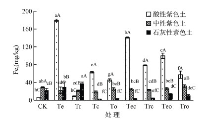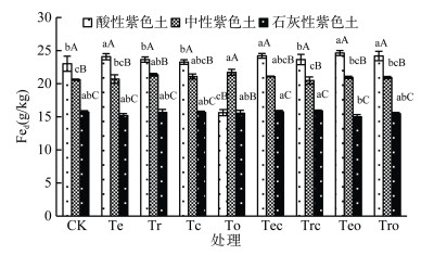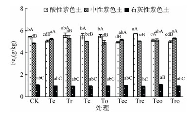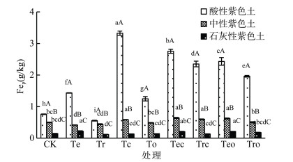 (图中不同小写字母表示同种土壤不同处理间差异性显著(P < 0.05),不同大写字母表示同一处理不同土壤之间差异性显著(P < 0.05);下同) 图 1 PP与LMWOA对3种紫色土Fes的影响 Fig. 1 Effects of PPs and LMWOAs on Fes contents in three purple soils |