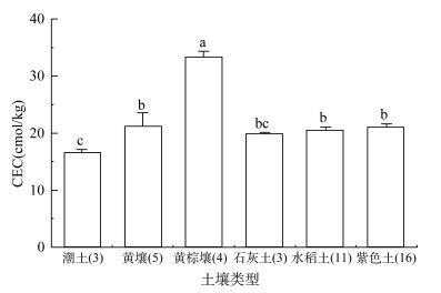 1) 研究区域内不同土壤类型CEC差异显著,黄壤、水稻土和紫色土CEC显著高于潮土(P < 0.05),而显著低于黄棕壤(P < 0.05)。