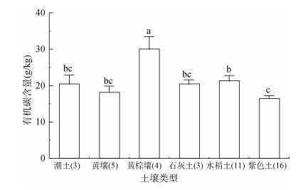 图 2 不同土壤类型之间有机碳含量的差异 Fig. 2 Organic carbon contents of different soils |