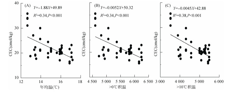 图 3 年均温和积温对土壤CEC的影响 Fig. 3 Effects of mean annual temperature and accumulated temperature on soil CEC |