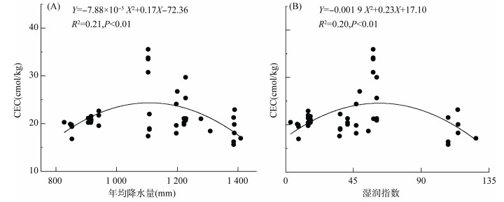 2.2.2 降水降水能影响生物的生命活动和土壤的风化淋溶,从而影响土壤胶体数量[26-27]。本研究进行了年均降水量、湿润指数和干燥度对土壤CEC影响的探究,结果表明,年均降水量和湿润指数对土壤CEC的影响较大,且土壤CEC与二者呈二次函数关系(图 4,P < 0.01),而干燥度对土壤CEC的影响不显著(P > 0.05)。这主要是因为降水因素能影响土壤的含水量,从而控制土壤的理化反应。在降水量较低时,随着降水增加,植物根系分泌大量有机物进入土壤,土壤有机胶体含量增加导致土壤CEC增加[26]。当降水量较高时,随着降水量的继续增加,土壤有机胶体的输入变化不大,但是土壤黏土矿物有从2:1型转变为1:1型的趋势,导致土壤CEC降低[27]。