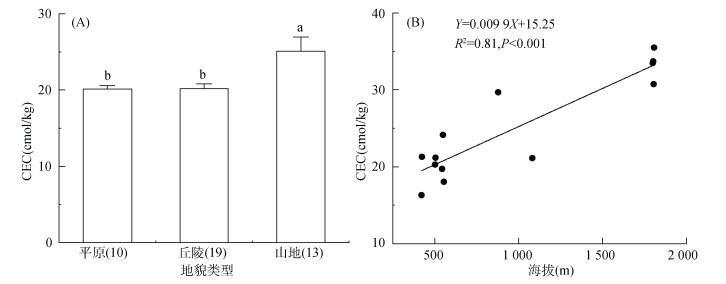 地形控制着地表水热资源的再分配,影响着土壤理化反应,进而影响土壤CEC。地貌类型和海拔作为主要的地形因素对土壤CEC具有较大影响[11-12]。在本研究中地貌主要为平原、丘陵和山地3种类型。3种地貌类型间土壤CEC存在显著性差异(图 5A,P < 0.05)。山地土壤CEC(25.10 cmol/kg ± 1.83 cmol/kg)显著高于平原(20.1 cmol/kg ± 0.45 cmol/kg)和丘陵土壤(20.18 cmol/kg ± 0.64 cmol/kg)(P < 0.05),平原和丘陵土壤CEC差异不显著(P > 0.05)。这是因为平原和丘陵多为耕地,土壤有机质主要来源于施肥和秸秆返田,而山地土壤则林草地较多,输入土壤的有机质较以上二者更多。同时,区内西南部山地温度较低,土壤有机质的累积高于中部盆地和东北部丘陵,所以其CEC显著高于平原和丘陵土壤。