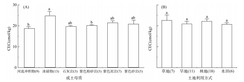 2.2.4 成土母质成土母质的差异会影响发育土壤的有机胶体和矿质胶体数量[29],导致土壤CEC存在差异[13]。在本研究区内,不同母质发育而成土壤的CEC存在显著性差异(图 6A)。其中,冰碛物母质发育土壤的CEC(24.97 cmol/kg ± 1.86 cmol/kg)显著高于河流冲积物(18.84 cmol/kg ± 0.73 cmol/kg)和紫色粉砂岩(20.3 cmol/kg ± 0.24 cmol/kg)发育而成的土壤(P < 0.05),而石灰岩、紫色泥岩和紫色砂岩这3种母质发育土壤的CEC之间差异不显著(P > 0.05)。这是因为河流冲积物和紫色粉砂岩发育土壤多为水田和旱地,它们二者的有机物主要来源于有机肥施用和部分秸秆还田。相反,本研究所采冰碛物母质发育形成的土壤质地较为黏重,且多为常绿阔叶林地或马尾松林地,林下凋落物较多。因此,冰碛物母质发育形成土壤的胶体数量高于河流冲积物和紫色粉砂岩发育而成的土壤,其CEC显著高于后二者(P < 0.05)。
