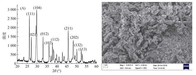 (A.珊瑚砂的XRD谱图;B.珊瑚砂的SEM图片(图中圈画标识为文石晶须)) 图 1 珊瑚砂的X射线衍射谱图及SEM图片 Fig. 1 X-ray diffractogram and SEM photograph of coral sand |