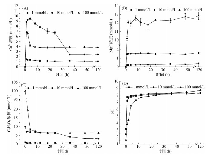 1.4.2 不同浓度柠檬酸对珊瑚砂溶蚀动态过程准确称取烘干后的珊瑚砂5.00 g于250 ml锥形瓶中,分别与1、10、100 mmol/L的柠檬酸溶液100 ml混合后,加盖硅胶塞防止空气中的CO2进入。置于30 ℃,185 r/min的摇床中振荡。分别于1、2、4、8、12、18、24、36、48、72、96、120 h时将锥形瓶取出,用隔膜真空泵(50 µm滤膜)快速过滤固液分离,测定液体部分的pH和Ca2+、Mg2+及柠檬酸浓度,并运用XRD和红外光谱仪分析固体部分组成,SEM观察其表面形貌。