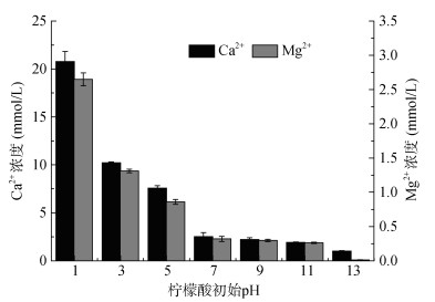 图 3 不同pH柠檬酸48 h时Ca2+、Mg2+浓度 Fig. 3 Concentrations of Ca2+ and Mg2+ of citric acid with different pH values at 48 h |