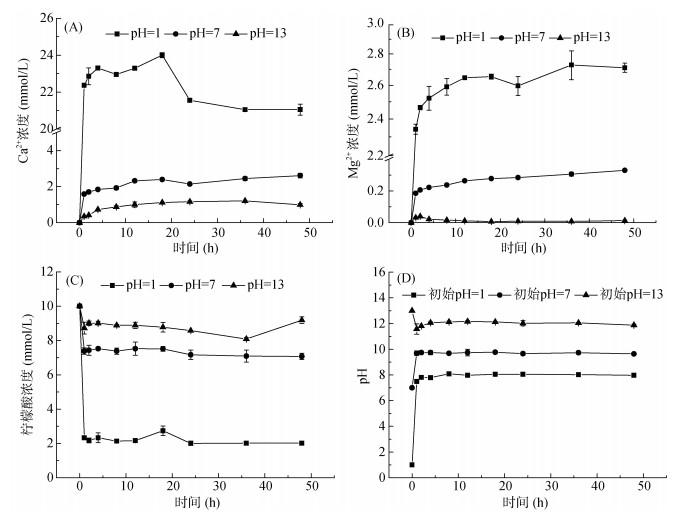 1.4.3 不同pH对柠檬酸溶蚀珊瑚砂的影响准确称取备用的珊瑚砂5.00 g于250 ml的锥形瓶中,分别与不同初始pH(1、3、5、7、9、11、13)、浓度为10 mmol/L的100 ml柠檬酸溶液(用1 mol/L NaOH和HCl调节)混合,加盖硅胶塞后于30 ℃,185 r/min摇床中振荡48 h,快速过滤固液分离,测定液体部分pH和Ca2+、Mg2+及柠檬酸浓度。