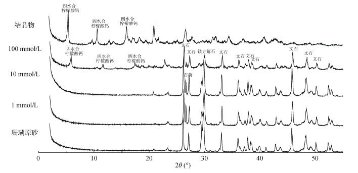 图 5分别为1、10、100 mmol/L的柠檬酸与珊瑚砂振荡反应120 h后固相,100 mmol/L的柠檬酸与珊瑚砂反应1 h固液分离后液相部分静置一段时间后结晶析出固体产物,以及珊瑚原砂的XRD谱图。分别运用Jade 6.5对其物相组成及含量进行分析,结果如表 2所示,当柠檬酸浓度为100 mmol/L时,有大量四水合柠檬酸钙沉淀的产生,随着柠檬酸浓度的增大,镁方解石/方解石的相对含量逐渐减小。