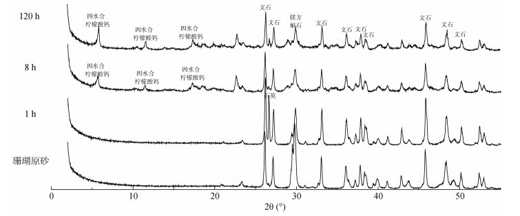 图 7 柠檬酸(100 mmol/L)与珊瑚砂反应不同时间固体部分XRD谱图 Fig. 7 XRD of solid fractions after citric acid (100 mmol/L) reacted with coral sand for different time |