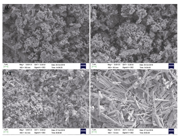 (A. 1 mmol/L柠檬酸;B. 10 mmol/L柠檬酸;C.100 mmol/L柠檬酸;D.100 mmol/L柠檬酸与珊瑚砂反应1 h液相部分静置一段时间后结晶析出固体) 图 8 不同浓度柠檬酸与珊瑚砂反应120 h后固相部分的SEM图片 Fig. 8 SEM photograph of solid phase fractions after citric acid reacted with coral sand for 120 h |