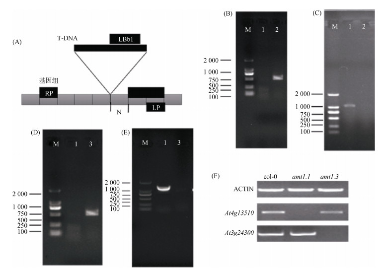 (A:T-DNA突变体插入片段PCR鉴定模式图;B:col-0和amt1.1的LBb1和LP引物扩增结果;C:col-0和amt1.1的RP和LP引物扩增结果,其中M为Takara DL 2000 DNA Marker,1为col-0,2是amt1.1;D:col-0和amt1.3的LBb1和LP引物扩增结果;E:col-0和amt1.3的RP和LP引物扩增结果,M为Takara DL 2000 DNA Marker,1为col-0,3是amt1.3;F:col-0、amt1.1、amt1.3株系在At4g13510和At3g24300的表达结果,ACTIN1为内参) 图 1 amt1.1和amt1.3拟南芥缺失突变体鉴定 Fig. 1 Identification of amt1.1 and amt1.3 knockout mutants |
