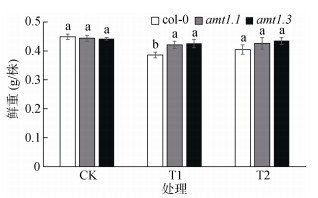 从图 2可以看出,CK处理下,col-0和amt1.1、amt1.3三种植株地上部分鲜重没有显著差异。与CK处理相比,T1处理下拟南芥植株的鲜重出现降低,3种植株的降幅分别降低了13.9%、5.2%和3.6%,其中col-0植株的降低幅度最大,远远大于amt1.1和amt1.3植株。与T1处理相比,T2处理下3种植株的鲜重有所增加,增加的幅度依次为4.8%、1.2%和2.1%,其中,col-0植株的增加幅度大于amt1.1和amt1.3植株,表明蔗糖可以缓解高NH4+胁迫对拟南芥生长的抑制,其中对col-0植株的效果更为明显。