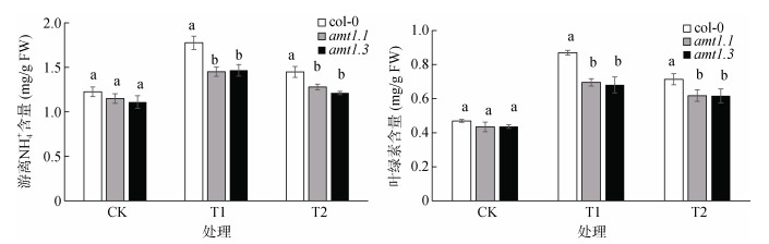 1 材料与方法 1.1 材料野生型拟南芥(Arabidopsis thaliana, Columbia)为本实验室保存(下文简称col-0)。Salk-063887C (下文简称amt1.1)和CS372164 (下文简称amt1.3)这两个AMT的T-DNA插入突变体购自ABRC (www.arabidopsis.org)。