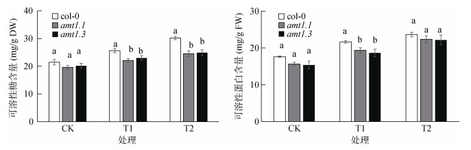 2.4 外源蔗糖对高NH4+胁迫下拟南芥植株可溶性糖和可溶性蛋白含量的影响植物中碳水化合物是重要的渗透调节物质。由图 4可见,CK处理下,col-0、amt1.1和amt1.3植株的可溶性糖含量并没有明显差异;T1处理下,与CK处理相比,col-0、amt1.1和amt1.3植株的可溶性糖含量分别增加21.5%、12.1%和12.3%,其中col-0植株的增长明显高于amt1.1和amt1.3植株,col-0和amt1.1、amt1.3植株间达到显著性差异。与T1处理相比,T2处理下,col-0、amt1.1和amt1.3植株的可溶性糖含量分别增加17.7%、11.2%和8.4%,col-0植株的增长更为明显,col-0和amt1.1、amt1.3植株间达到显著性差异。