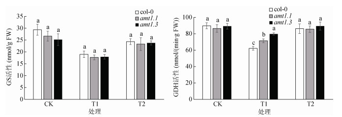 2.5 外源蔗糖对高NH4+胁迫下拟南芥植株GS和GDH活性的影响GS、GDH是氮代谢中的关键酶,GS是无机氮转化为有机氮的关键酶,GDH是连接碳、氮代谢的关键点。从图 5可知,与CK处理相比,T1处理下,叶片中GS的活性呈现大幅度的降低,col-0、amt1.1和amt1.3植株分别下降了35.1%、35.6%和29.2%,其中col-0植株的降低幅度最大,说明高NH4+胁迫降低了GS的活性,对col-0植株的胁迫最为明显,但是3个株系植株之间并没有显著性差异;与T1处理相比,T2处理下,3个株系植株的GS活性出现不同程度的增加,分别提高了38.1%、44.8%和35.8%,说明外源蔗糖可以提高植株中GS的活性,促进植物中无机氮转化为有机氮的过程。