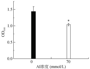 2 结果与分析 2.1 红酵母RS1对铝的耐性在LPM培养基中培养24 h后,对照组的OD600值为1.599,而70 mmol/L铝处理组的OD600值为1.001(图 1)。可见,相应浓度的铝处理显著抑制了RS1菌体的生长量,约抑制了RS1菌体37%的生长量。