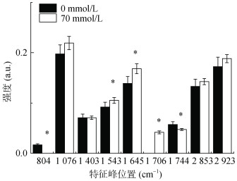 (图中显示的峰位置为对照组峰位置,下图同) 图 3 RS1铝处理及对照的傅里叶红外光谱特征峰强度 Fig. 3 FTIR intensities of RS1 with and without Al treatment |