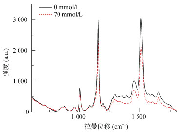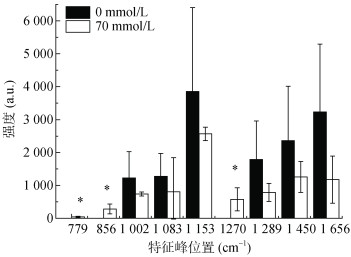 图 4和表 2还显示,铝处理后RS1出现了3个新的特征峰,分别是779 cm–1核糖核酸(RNA)峰、856 cm–1的酪氨酸峰和1 270 cm–1酰胺Ш带峰。然而,检测到的特征峰并无明显漂移现象,也无显著强度变化(图 5)。