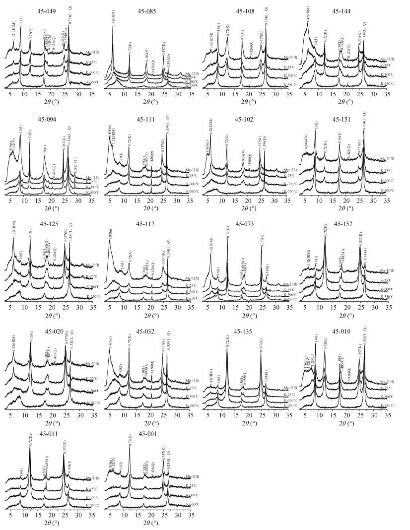 表 3 主要层状黏粒矿物d001XRD衍射特征(nm) Table 3 X-ray diffraction characteristics of d001 (nm) of main phyllosilicate minerals |