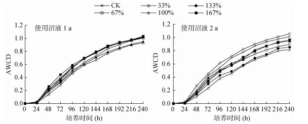 使用沼液1 a时,在对数期,133%沼液处理AWCD值最大,100%沼液处理AWCD值最小;在减速期至稳定期,67%、100%、200%沼液处理间AWCD值出现明显差异,其余处理AWCD曲线发生重合。使用沼液2 a时,各处理间AWCD值差异于对数期开始显现,33%沼液处理AWCD值最大,单施化肥的CK处理次之,67%、167%、200%沼液处理居中,133%、100%沼液处理最小;在减速期,67%、167%、200%沼液处理AWCD曲线出现交叉现象;在稳定期,67%沼液处理AWCD值上升速度减缓,与其他处理差异明显,167%、200%沼液处理AWCD曲线基本重合。