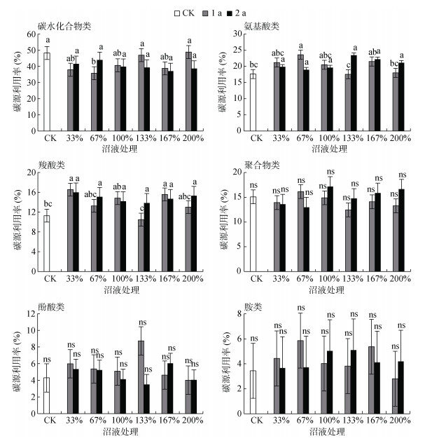 (图中不同小写字母表示同一年限下各处理间差异显著(P < 0.05),ns表示差异不显著;下同) 图 2 不同沼液处理下土壤微生物碳源利用率 Fig. 2 Use efficiency of soil microbial carbon source under different biogas slurry treatments |