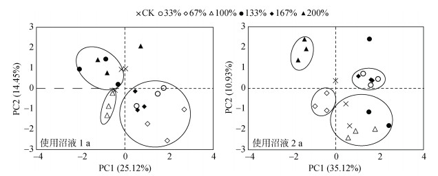 根据主成分分析法(PCA),在使用沼液1 a和2 a试验样品中各自提取9个主成分(特征根 > 1),累积贡献率分别达84.38%和86.44%,第1主成分(PC1)贡献率分别是25.12%和35.12%,第2主成分(PC2)贡献率分别是14.45%和10.93%。因第3至第9主成分方差贡献率较小,本文选取第1主成分和第2主成分作图来表征土壤微生物群落碳源代谢特征(图 3)。