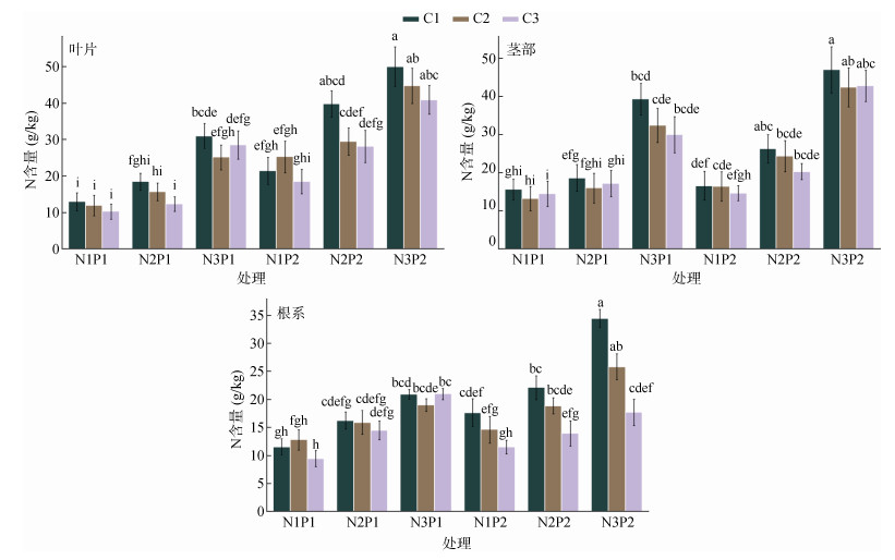 2 结果分析 2.1 黄瓜植株各组织氮、磷元素含量对大气CO2浓度与氮磷供应水平的响应 2.1.1 氮元素含量的响应图 1表明,在相同大气CO2浓度以及相同供磷条件下,黄瓜植株叶片、茎部和根系的N含量都随着氮素供应水平的提高呈增加的趋势,并且在N3水平下,植株各部分的N含量基本都明显高于N1、N2水平。而在相同供氮与供磷水平下,CO2浓度升高会使得植株中N含量相对下降,特别是根部在P2处理下,N含量随CO2浓度升高下降趋势表现的更为明显。在CO2浓度和供氮水平相同条件下,相较于P1水平,P2水平会显著提高植株各部位的N含量。对于N含量在黄瓜植株内的分布而言,叶片和茎部明显高于根部。