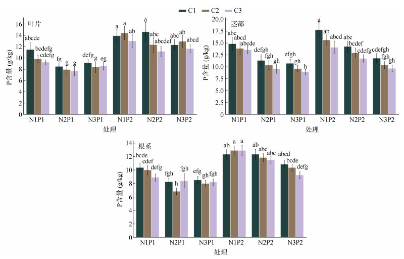 本试验中,在CO2浓度和供磷水平条件一致的情况下,随着供氮水平的提高,黄瓜叶片、茎部和根系的氮元素含量有较为明显增加的趋势,在N3条件下最为明显。在不同氮素水平下对番茄磷钾吸收和分配的研究中显示,氮可以促进植物对磷的吸收,提高磷肥利用率[23]。而在本试验中,在C1和P2条件下的叶片由N1到N2以及C2、P1条件下的根系中N2至N3的情况下与该结果一致。