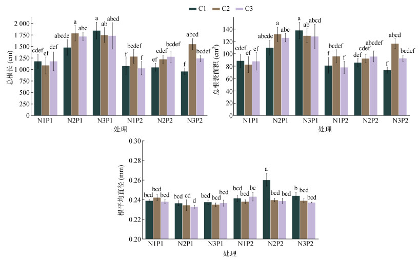 2.3 黄瓜根系生长对大气CO2浓度与氮磷供应水平的响应由图 3可见,在P1条件和相同CO2施肥条件下,总根长和总根表面积随着供氮水平的提高而呈明显增加趋势,而在P2条件下,无明显的变化趋势。在氮水平和磷水平相同条件下,随着CO2浓度的增加,总根长与总根表面积有一定的增大趋势。在相同CO2施肥和供氮条件下,P1条件下的总根长和总表面积明显大于P2条件下,尤其是在N2和N3条件下。从图 3看出,CO2施肥与不同供氮、磷水平下对根平均直径大小的影响趋势并不是很明显。