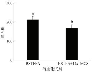 (图中小写字母不同表示不同处理间差异达P < 0.05显著水平,下同) 图 1 衍生化试剂BSTFA与BSTFA+1%TMCS对1, 9-癸二醇衍生化效果的对比(n = 3) Fig. 1 Derivatization abilities for 1, 9-decanediol silylated by different derivative reagents BSTFA and BSTFA+1% TMCS |