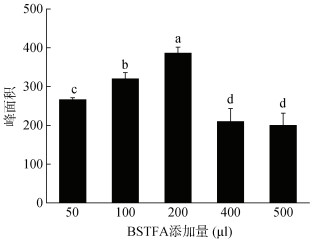 图 2 不同衍生化试剂BSTFA添加量对1, 9-癸二醇衍生化产物响应值的影响(n = 3) Fig. 2 Response of trimethylsiyl derivatives of 1, 9-decanediol with BSTFA under different volumes |