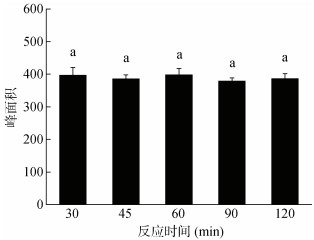 分别向装有标准物质1, 9-癸二醇的螺口试管中加入200 μl BSTFA衍生化反应30、45、60、90、120 min,比较5个不同的衍生时间对衍生效果的影响。结果如图 3所示,1, 9-癸二醇的衍生化产物在反应30 min时已经有较高的响应值,而随着反应时间(45、60、90、120 min)的增加,产物的峰面积并无显著变化。该结果与雌激素类物质、烟草中的游离糖类、药用植物长春花中的五环三萜类化合物的衍生化时间一致[21, 27, 34-35],说明衍生化反应进行迅速,在30 min时已经反应完全,增加反应时间并不能提高衍生化产物的响应值。因此,1, 9-癸二醇衍生化反应中衍生化时间控制在30 min即可。