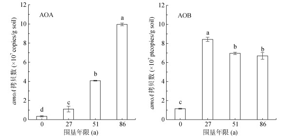 图 2 不同围垦年限湿地土壤AOA和AOB amoA功能基因拷贝数 Fig. 2 Abundances of ammonia-oxidizing archaea (AOA) and ammonia-oxidizing bacteria (AOB) amoA genes in soils with different reclamation years |