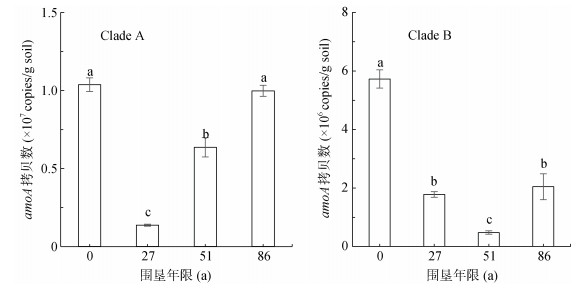 图 3 不同围垦年限Comammox amoA功能基因拷贝数 Fig. 3 Abundances of Comammox amoA genes in soils with different reclamation years |
