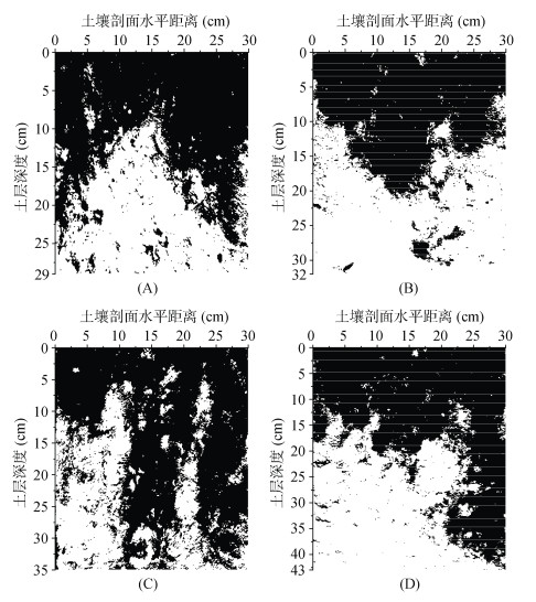 1.4 染色图像处理将拍摄到的土壤剖面染色图像导入到Photoshop软件中,通过裁剪、校正等步骤将图片转化为由黑色(像素值为0)和白色(像素值为255)组成的二元信息矩阵图像;运用Image Pro Plus进行降噪处理并输出由0和255组成的二值矩阵,以此二值矩阵为依据对优先流区染色面积比(DC)、基质流入渗深度(UniFr)、平均最大入渗深度(Umax)、土壤优先流分数(PF-fr)、长度指数(Li)、分形维数(D)、土壤染色形态变异系数(CV)进行计算。
