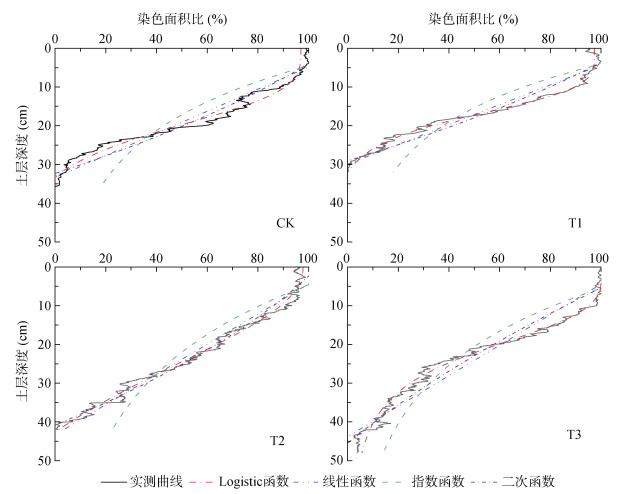 图 2 4种函数对土壤染色面积比与土层深度的关系拟合效果图 Fig. 2 Fitting effects of relationship between soil dyeing area ratio and soil depth |