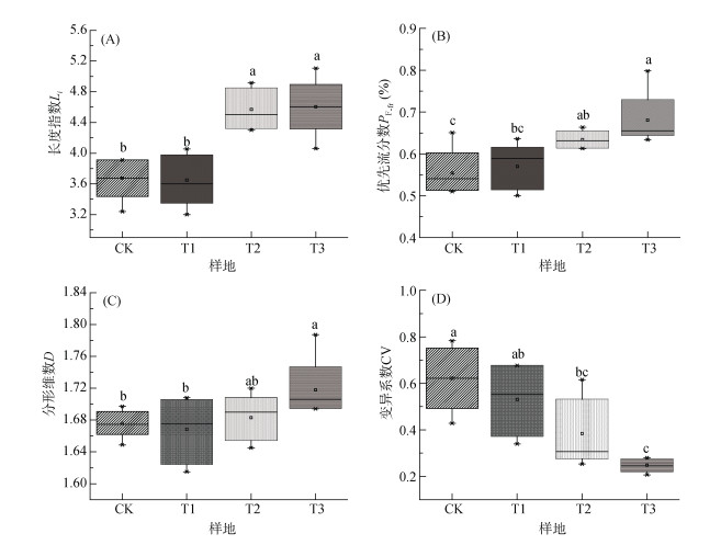 (图中不同小写字母表示各样地间差异显著(P < 0.05)) 图 3 不同有机肥施用量样地土壤优先流指标箱线图 Fig. 3 Boxplot plots of preferential flow parameters of sample plots under different organic fertilizer application rates |