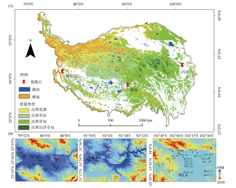 图 1 青藏高原植被类型(A)和土壤水分监测站点分布(B,从左到右依次为狮泉河、那曲、玛曲) Fig. 1 Distribution of vegetation types (A) and observation sites (B, from left to right are Shiquanhe, Naqu and Maqu) |