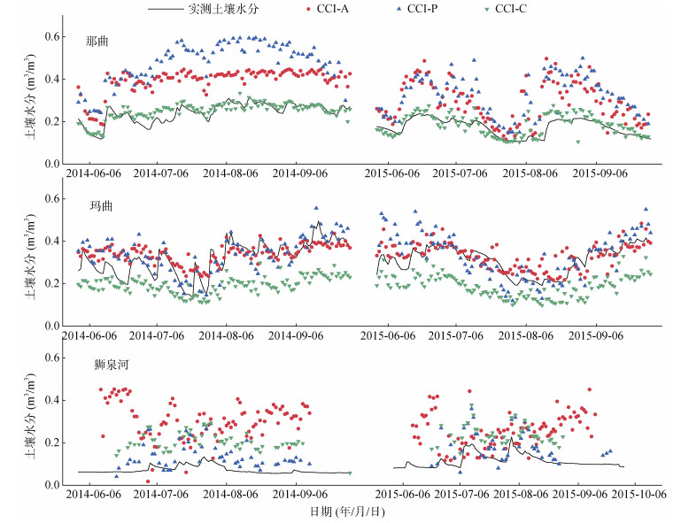 2 结果 2.1 土壤水分的时间序列由2014、2015年生长季6—9月CCI土壤水分产品与实测数据时间序列可以看出(图 2),3种产品都能反映3个网络土壤水分的时间变化规律。主动产品在玛曲地区与地面观测数据具有很好的一致性,在那曲地区变化幅度较大,在狮泉河地区一致性较差;被动产品在玛曲和狮泉河地区较好地捕捉了土壤水分的变化,但在那曲地区同样显示过高的变化范围;主被动组合产品可以很好地捕捉到那曲地区的土壤水分变化动态,也能很好地表现玛曲地区和狮泉河地区的变化趋势,但是在玛曲地区有明显的低估现象,狮泉河地区有明显的高估,结果从CCI产品与实测数据的散点图中也可以看出(图 3)。由CCI土壤水分数据和实测数据相关性和误差分析(表 2)可知3个产品都能较好地反映3个网络的时间变化趋势,产品与观测资料的相关系数均通过了0.05的显著性检验。主动产品在玛曲地区误差最小,但由于其对那曲和狮泉河地区虚假的高估不能很好地代表青藏高原土壤水分变化;被动产品在玛曲和狮泉河地区的误差较小,但相关性略低于主被动组合产品;而主被动组合产品与实测数据的相关性系数都是最高的(那曲地区0.870,玛曲地区0.742,狮泉河地区0.774),在那曲地区的误差最小,在玛曲和狮泉河的系统性误差可由一元线性回归方法校正,总体来看在3个网络上表现出最佳性能。