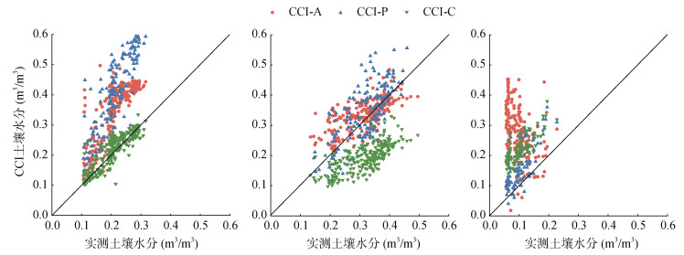 图 3 CCI产品与实测土壤水分数据散点图 Fig. 3 Scatter plots of soil moistures retrieved from CCI products and in-situ measurement |