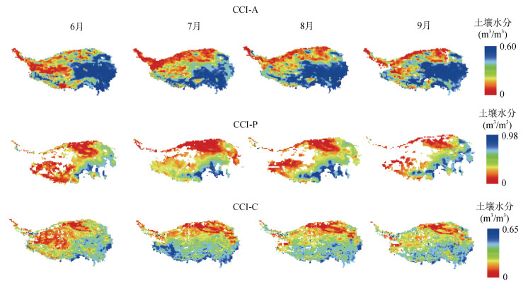 在空间分布上,CCI 3种产品在青藏高原地区的空间分布都符合土壤水分东南高西北低的基本分布特征[10]。其中主动产品显示过高估计土壤水分,被动产品在青藏高原的土壤水分变化范围过大,均不符合实际情况,而主被动组合产品反演的土壤水分分布较接近高原实际情况。7、8月份青藏高原西部干旱地区土壤水分与其他月份相比较为湿润,这可能是因为该地区7、8月份降水较集中[40]。东南部土壤水分值较高,是因为降水多,植被覆盖较多,所以有较强的固水能力[41]。